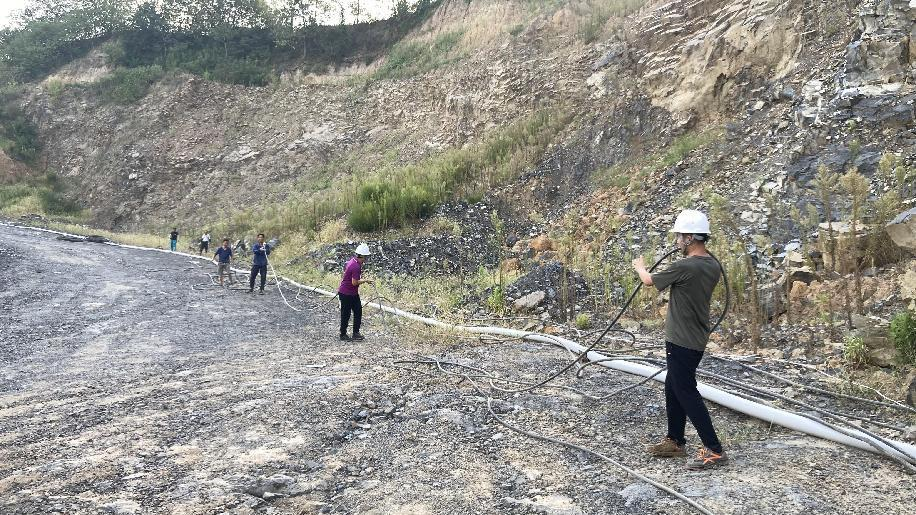 抗旱方案有了,可是要想把水從70米深的礦坑內抽到地面,不但需要揚程特別高的水泵,還需要高規(guī)格長距離的水管和電纜,還有很多配套零部件要采購。旱情就是命令,抗旱就是責任,興天礦業(yè)副總經(jīng)理趙崗牽頭落實抗旱物資采購,親自指揮設備調運安裝,帶領公司抗旱突擊隊和社區(qū)干部深入礦坑,一起研究水泵需要多大功率安裝在什么地方、水管需要多粗從哪里下放、電纜需要多長從哪里接電等問題。方案制定好了,老百姓的水稻不能等,挖掘機第一時間進場整理場地,興天礦業(yè)和社區(qū)準備的水泵、水管電纜等也迅速到位,抗旱突擊隊與社區(qū)干部群眾一起與時間賽跑,從早到晚緊張施工,一心想著的就是早點把水抽上去,盡量把旱情影響降到最低。